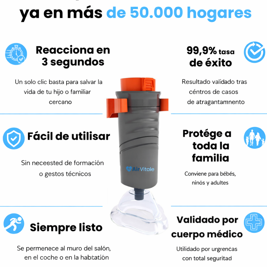 Un dispositivo como AirVitale se convierte en un equipo indispensable en casa. En una situación de atragantamiento, contar con una solución simple, inmediata y lista para usar marca toda la diferencia.